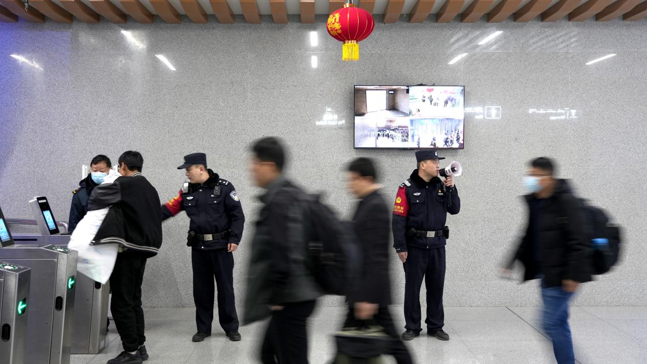 在春运返程高峰期,临汾西站派出所民警贴心提示旅客准备好身份证件,引导旅客安全有序进站乘车。