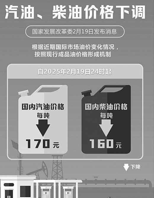 2月19日下午,发改委发布成品油价调整通知。本计价周期(2月6日24时到19日24时),在需求弱化的背景下,国际油价偏弱波动,均值环比下滑。2月19日24时,国内成品油零售限价进行2025年首次下调,消费者用油成本将明显降低。