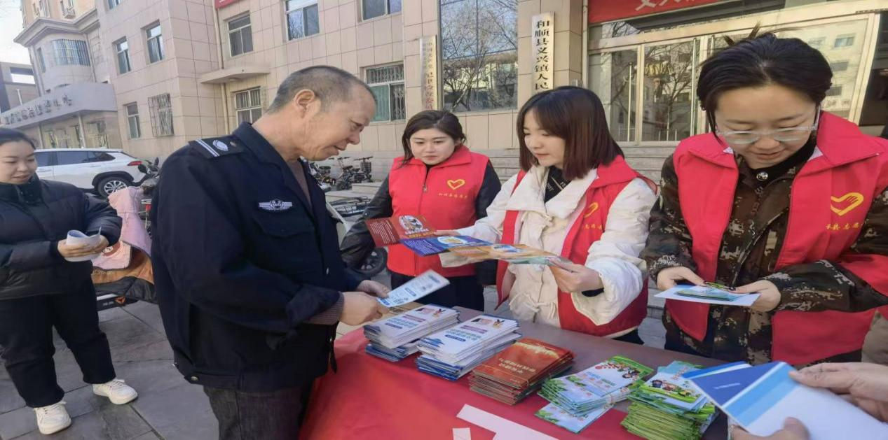 在和顺县义兴镇,和顺县委社会工作部组织志愿者发放低碳节能宣传手册,用通俗易懂的语言向市民讲解低碳节能常识,倡导市民践行低碳发展理念。