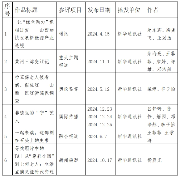 按照《关于开展第34届山西新闻奖评选的通知》要求,新华社山西分社拟推荐6件作品参评第34届山西新闻奖(名单附后),现予公示。