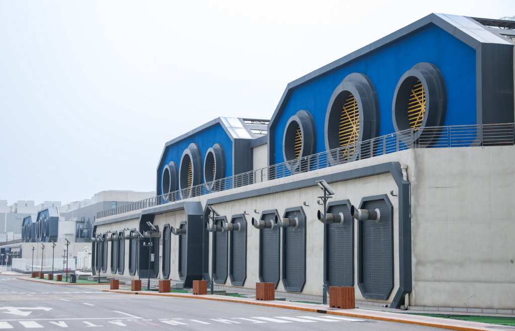 走进基地,九期占地40000至50000余平方米的机房整齐排列,赫然眼前。“目前,基地1-9期已投产运营,年度运行PUE低于1.2,是全国能效水平最优的数据中心之一。”据秦淮数据灵丘基地运维经理段宏伟介绍,基地所处的灵丘县气候寒凉,全年平均气温14度以下天数超200天,可有效降低节能成本。