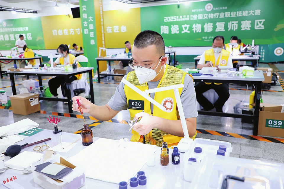 山西选手杨谢月在陶瓷文物修复师项目比赛现场。