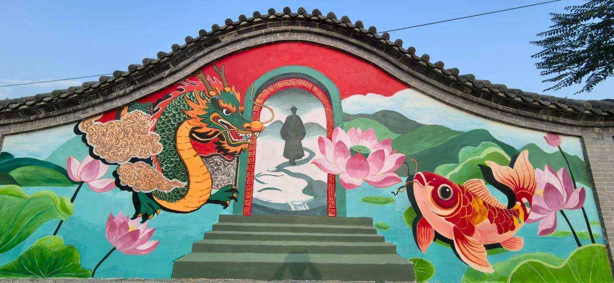 走进文化园内,一面充满艺术气息的墙绘映入眼帘。画面中一条栩栩如生的龙和一条金鱼隔拱门相望,巧妙呈现“鱼跃龙门”的意象。拱门内,是于成龙遥望山河的背影,背景则是盛开的莲花与翠绿的莲叶,整个画面生机盎然。
