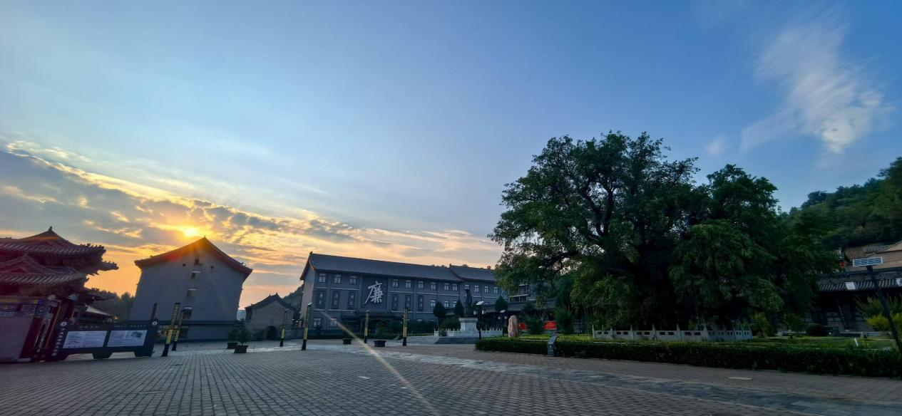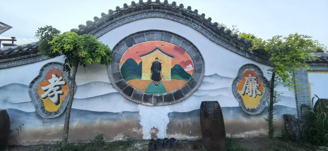 走到院墙背后,与正面形成呼应,画中于成龙坚定走来,两侧 “孝” 和 “廉” 二字赫然在目。