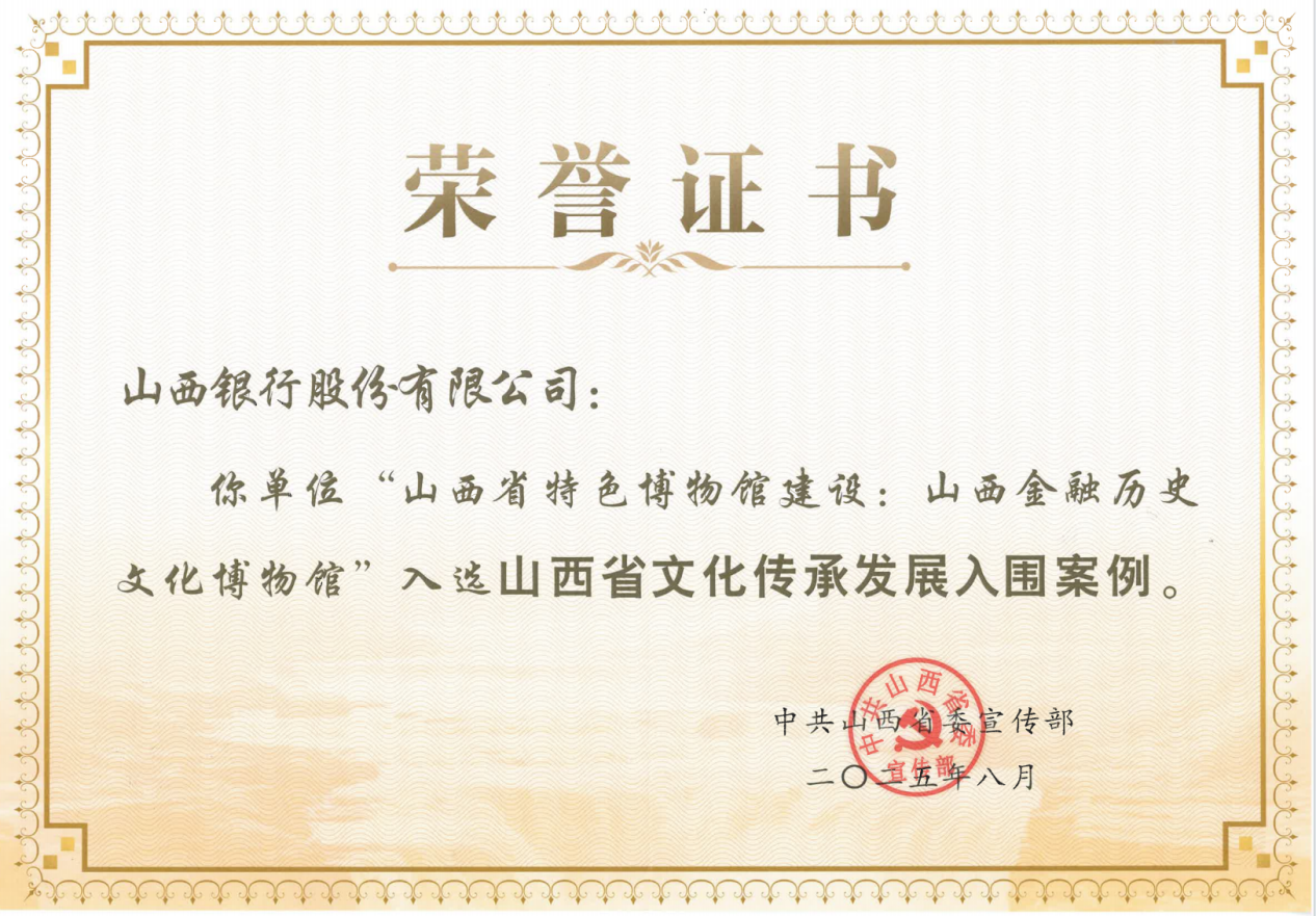 2024年11月,山西银行联合山西省委金融工委、中国人民银行山西省分行、晋商博物院共同打造山西金融历史文化博物馆。山西省委金融工委授予山西金融历史文化博物馆“山西金融文化教育示范点”。