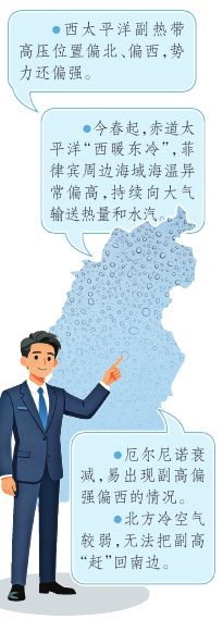 副高能如此“任性”,离不开“帮手”。今春起,赤道太平洋出现“西暖东冷”情况,菲律宾周边海域海温异常偏高,持续向大气输送热量和水汽。这些水汽与能量和副高结合后,使副高北移势头更稳。加之今年是厄尔尼诺衰减年,夏季本就易出现副高偏强偏西的情况。偏偏今年北方冷空气又较弱,没法把副高“赶”回南边,多重因素叠加,最终导致北部降水偏多、南部偏少。