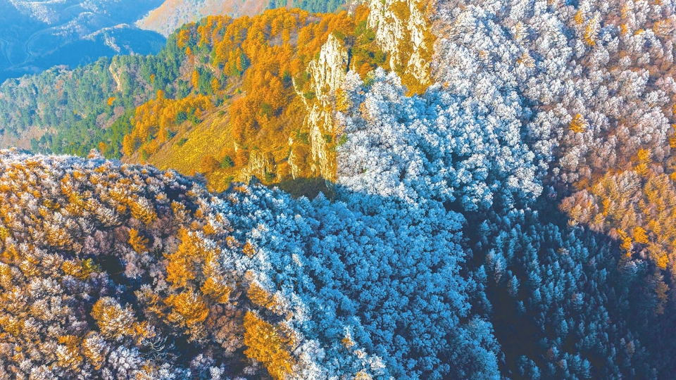 10月26日,受强冷空气影响,霍州市七里峪景区五龙壑海拔较高区域出现了难得一见的雾凇景观。漫山遍野的树木被冰晶包裹,晶莹剔透,玉树琼枝与尚未褪尽的斑斓秋色交相辉映,如梦如幻。田红萍摄
