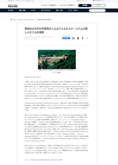 山西省晋城市依托深厚的历史文化底蕴与独特的古村落资源赋能文旅康养产业的生动实践,受到美联社、日本共同社、韩联社等多家海外媒体关注。来自欧美、亚太和非洲地区20个国家的1210家海外媒体、网站等对其进行了刊发转载。