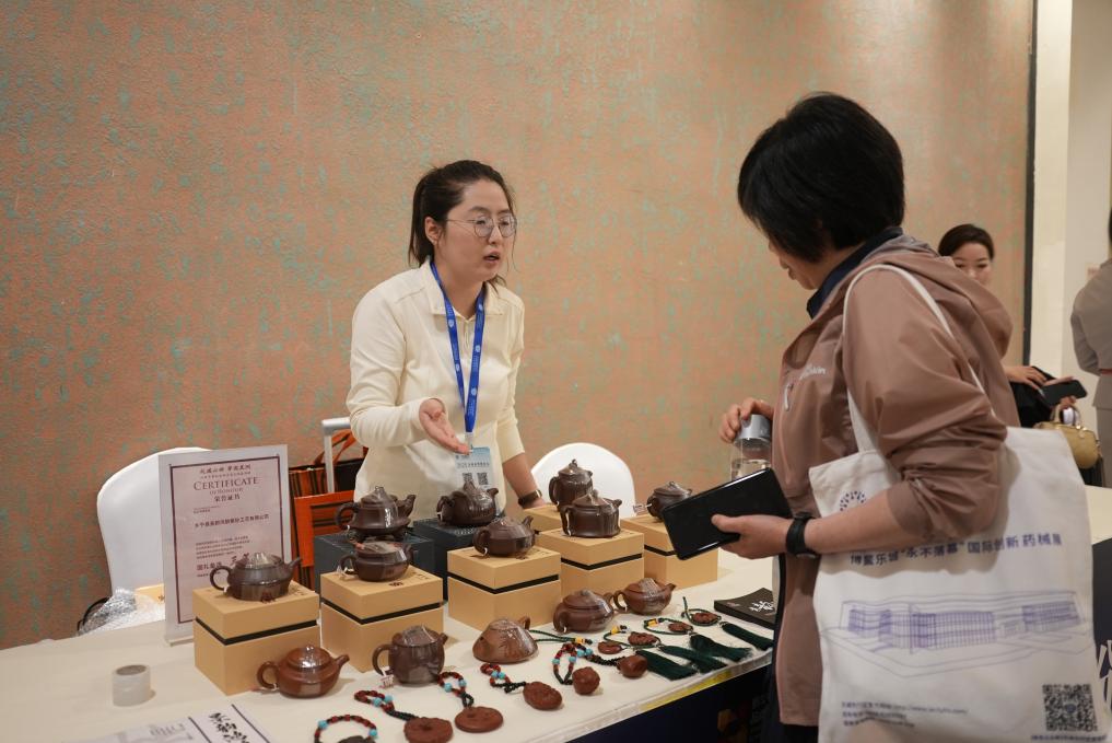 工作人员向与会嘉宾介绍乡宁紫砂产品。