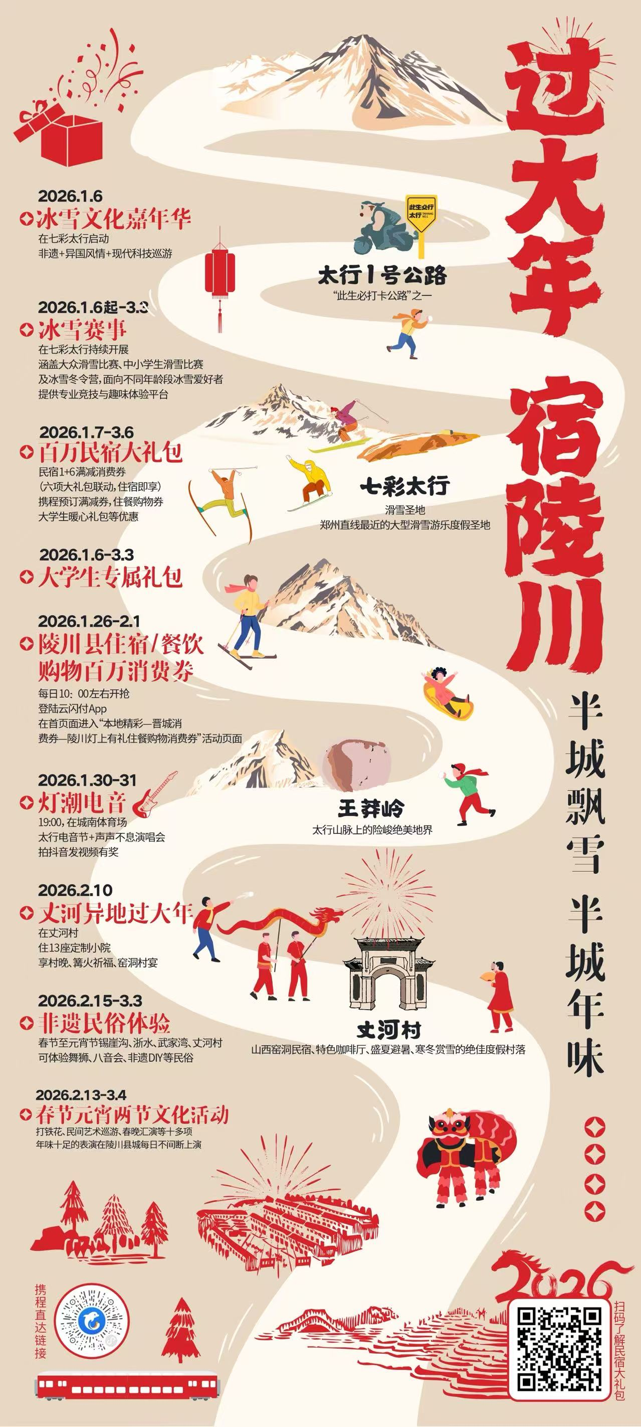 随着2026马年春节的脚步临近,山西晋城“太行山上过大年”系列活动在陵川县正在进行。陵川县以“过大年·宿陵川”为主题,推出了一场“半城飘雪、半城年味”的新春盛宴,为游客打造集冰雪运动、民俗体验、惠民消费于一体的沉浸式年俗之旅。