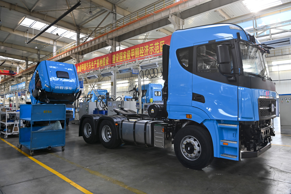 山西新能源汽车工业有限公司(吉利晋中基地)总装车间内的甲醇重卡。新华社记者 杨晨光 摄