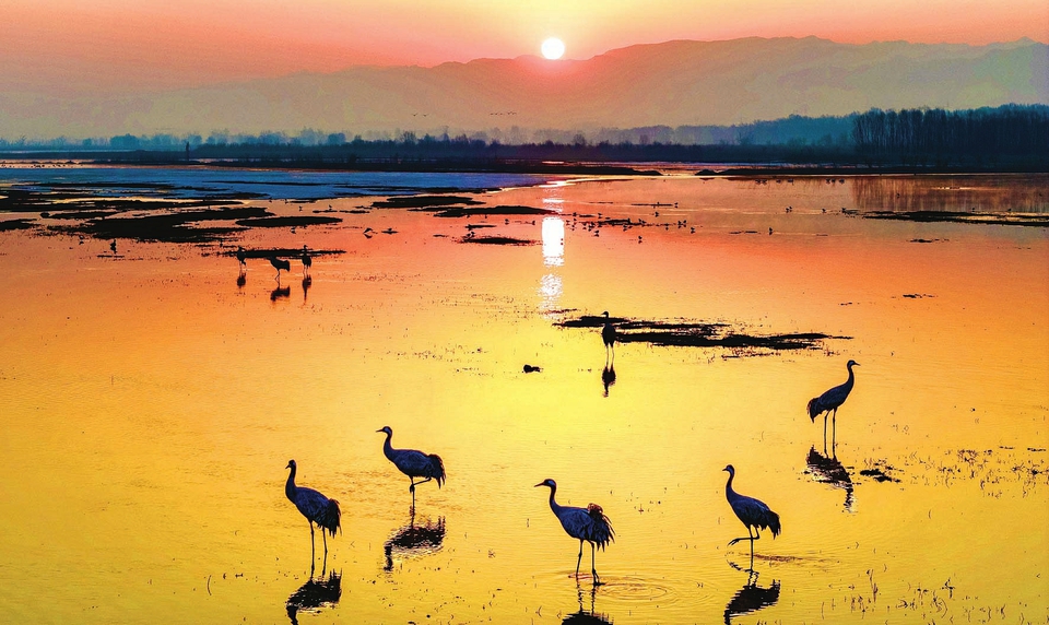 3月21日,大同市桑干河畔马坊村湿地迎来成群灰鹤。夕阳映照下,金色河面波光粼粼,灰鹤或伫立浅滩、或悠然觅食,与远山、湿地构成一幅和谐的生态画卷。(记者刘通摄)