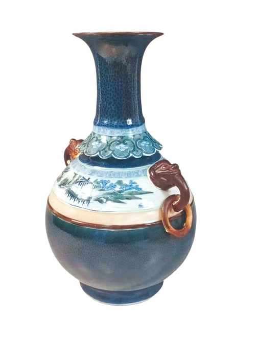 修复好的乾隆洒蓝釉开光青花山水纹兽首衔环双耳赏瓶。