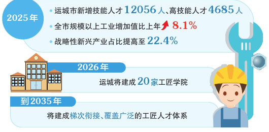 按照规划,2026年运城将建成20家工匠学院;到2035年,将建成梯次衔接、覆盖广泛的工匠人才体系。