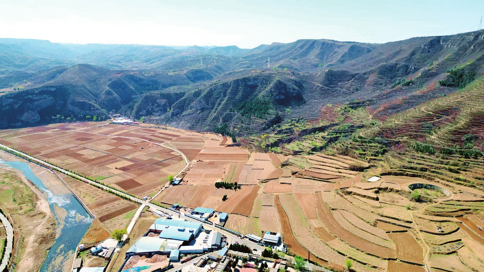 在平定县巨城镇移穰村桃河南岸的400余亩水浇田地上,村民们抢抓农时,整地播种。图为4月7日航拍镜头下的移穰村水浇田地。(刘胜摄)