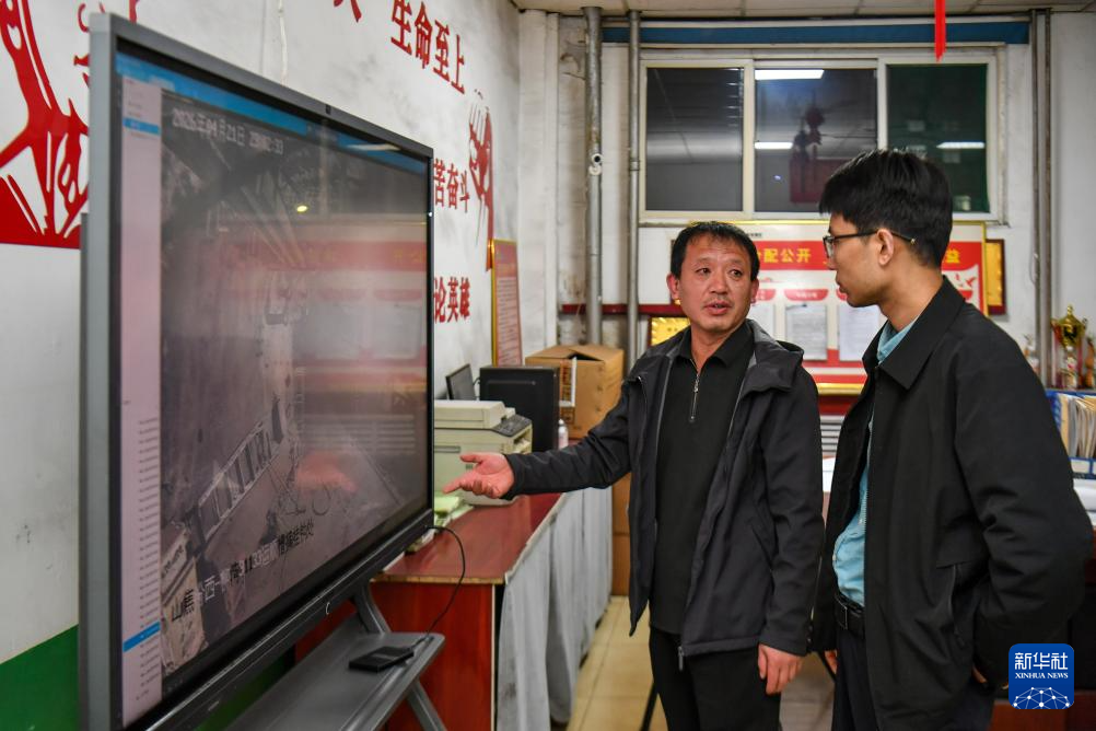 4月21日,山西焦煤汾西矿业集团柳湾煤矿矿工任世前(左)在和综采一队队长孟小强讨论巡查中发现的问题。