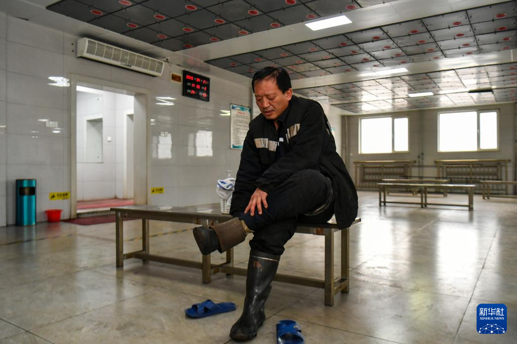 4月21日,山西焦煤汾西矿业集团柳湾煤矿矿工任世前在穿工靴。