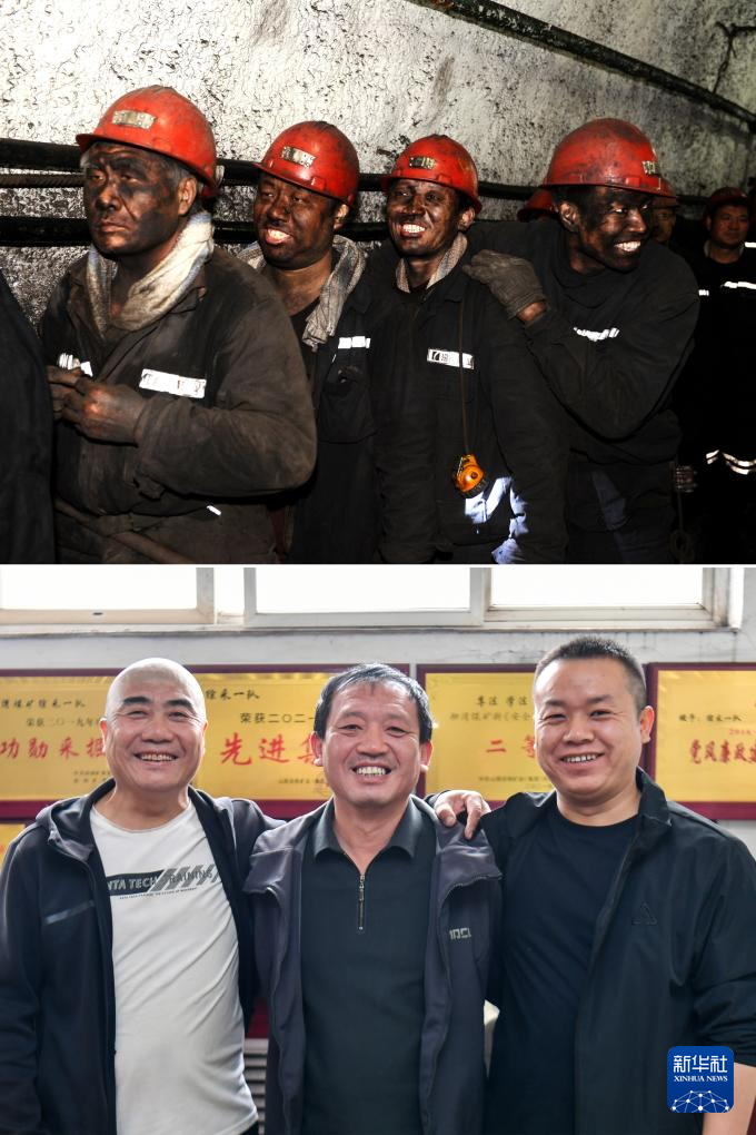 拼版照片:上图为2014年4月22日,任世前(左三)和工友们下班后在等待坐“猴车”回地面(新华社记者 燕雁 摄);下图为2026年4月21日,山西焦煤汾西矿业集团柳湾煤矿矿工任世前(中)和12年前共同接受新华社采访的工友李振海(左)、张鹏合影(新华社记者 曹阳 摄)。