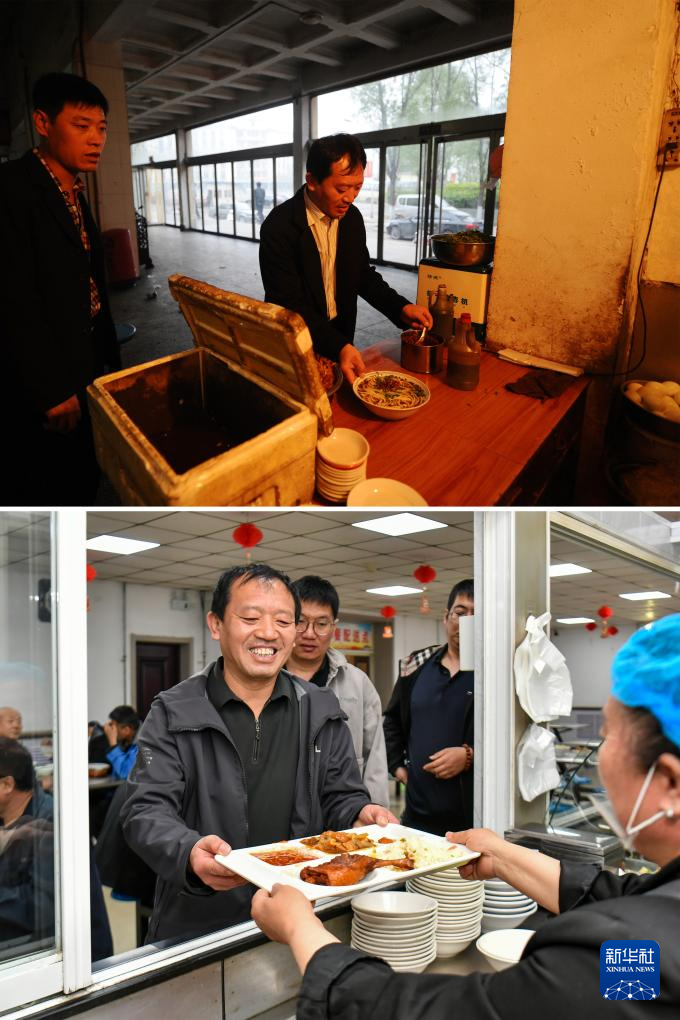 拼版照片:上图为2014年4月22日,任世前(右)在矿上的食堂买了一碗面当早餐(新华社记者 燕雁 摄);下图为2026年4月21日,山西焦煤汾西矿业集团柳湾煤矿矿工任世前(左前)在食堂购买午饭(新华社记者 曹阳 摄)。