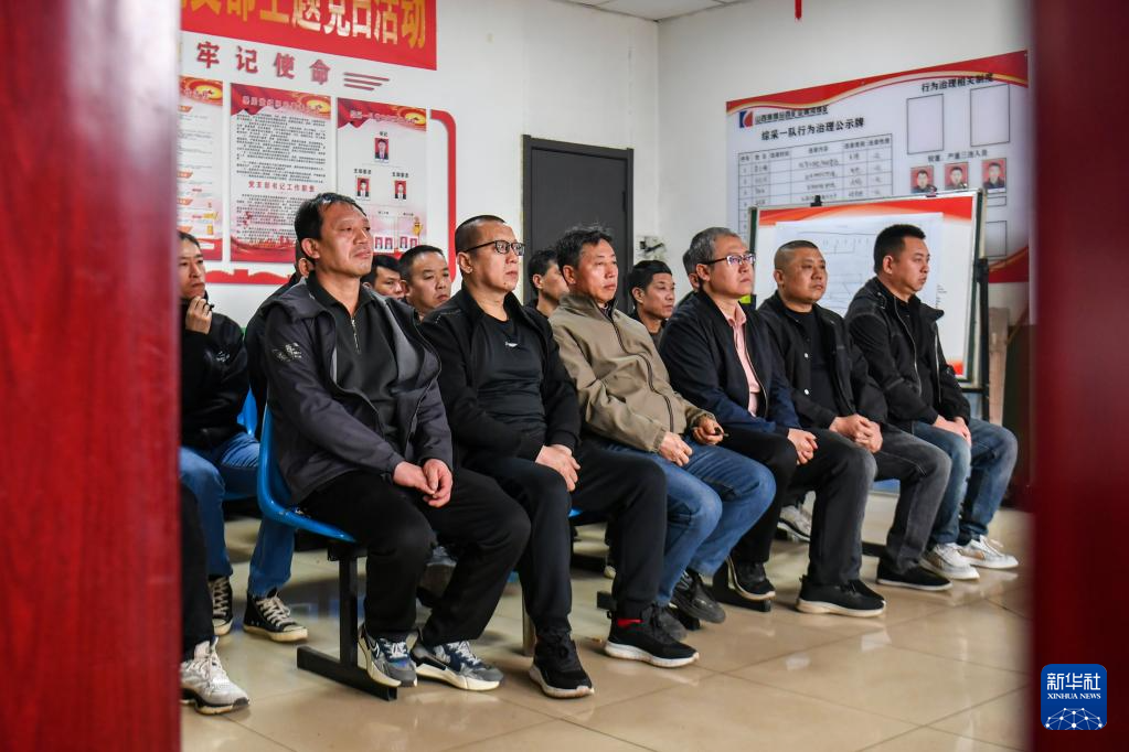 4月21日,山西焦煤汾西矿业集团柳湾煤矿矿工任世前(左前一)在开班前会。