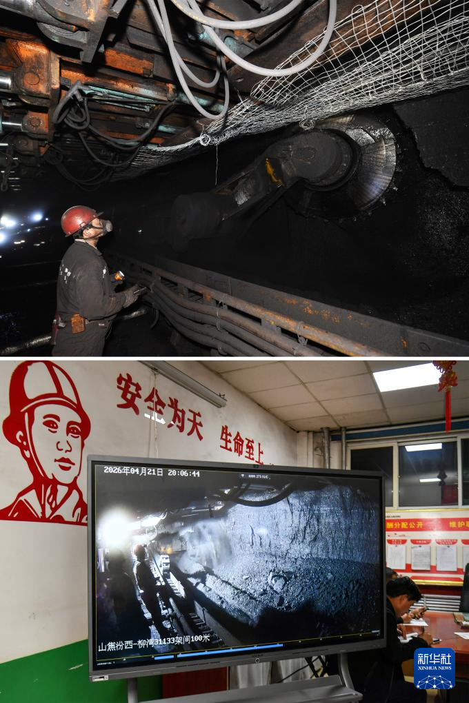 拼版照片:上图为2014年4月22日,任世前操控割煤机采煤(新华社记者 燕雁 摄);下图为2026年4月21日在山西焦煤汾西矿业集团柳湾煤矿综采一队办公室拍摄的任世前在矿井下工作的实时画面(新华社记者 曹阳 摄)。