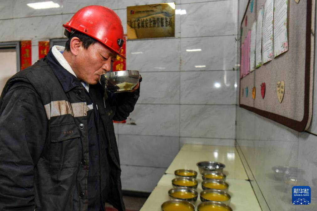 4月21日,山西焦煤汾西矿业集团柳湾煤矿矿工任世前在喝家属们为工人们准备的小米汤。