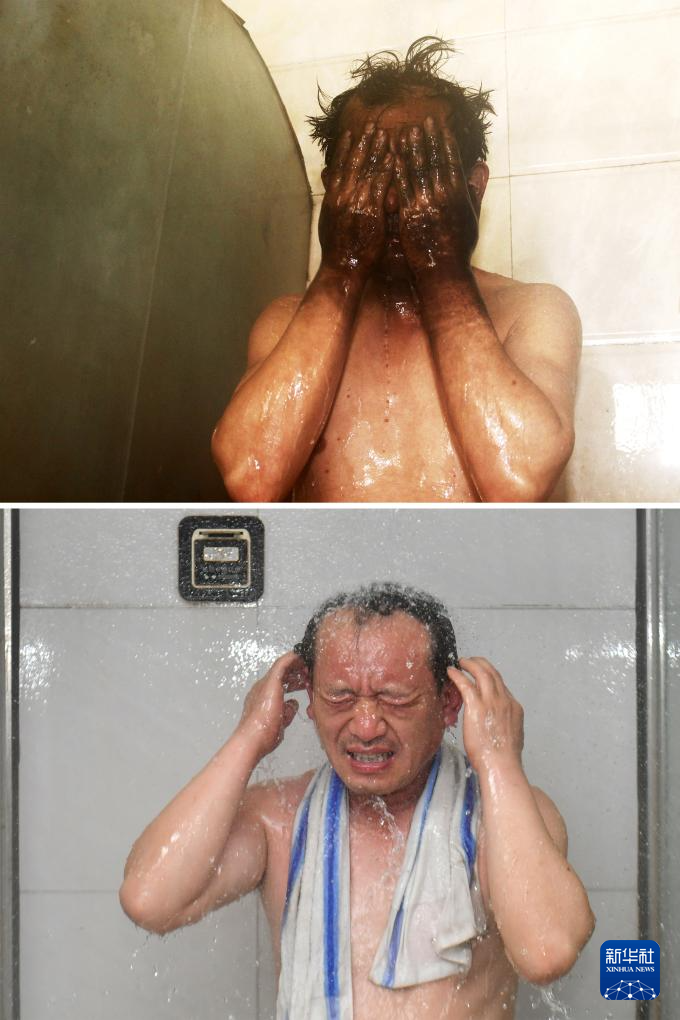 拼版照片:上图为2014年4月22日,任世前下班后在矿工浴室洗澡(新华社记者 燕雁 摄);下图为2026年4月21日,任世前下班后在矿工浴室洗澡(新华社记者 曹阳 摄)。